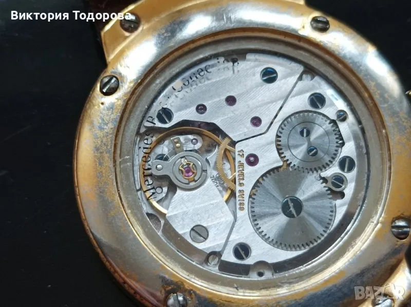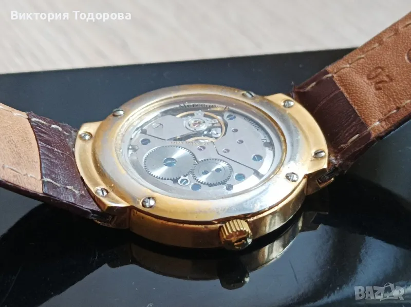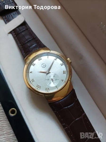 Здравейте! Предлагам изключително рядък мъжки механичен часовник Мерцедес Бенц. Часовникът работи добре и е с швейцарска машина. Много красив и запазен циферблат и стрелки. Продава се с оригиналната дървена и брандирана кутия. Има износване на позлата от долната страна.