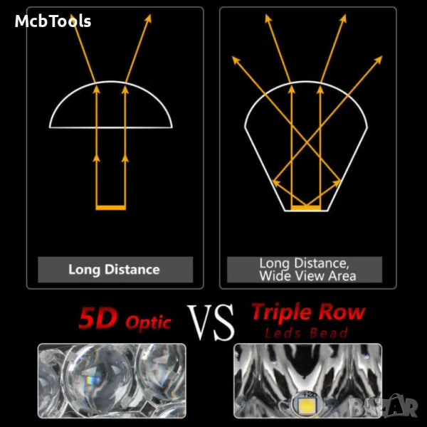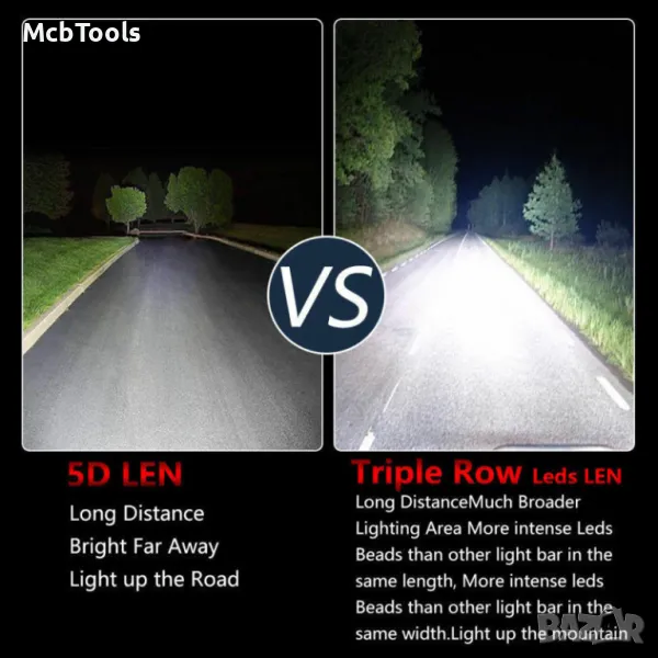 - Тип на ЛЕД БАРА: комбиниран – крайните диоди разпръскват светлината, а тези в средата светят концентрирано (напред)
