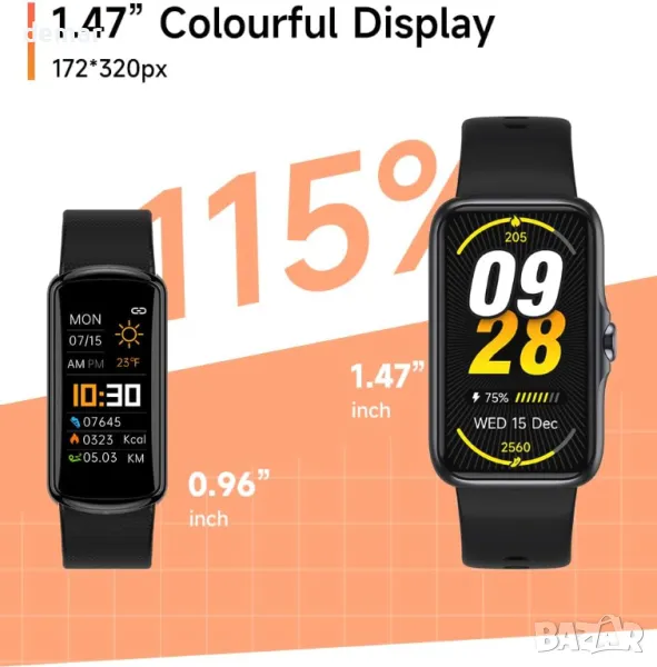 Този фитнес тракер предлага цялостен мониторинг на здравето, включително сърдечен ритъм, кръвно налягане и данни за съня. Той включва целодневно проследяване на активността с поддръжка за различни режими като колоездене, бягане и плуване, което позволява на потребителите да задават и преглеждат фитнес цели чрез приложението Gloryfit. Устройството включва ярък 1,47-инчов дисплей за известия от повиквания и съобщения, както и напомняния за хидратация и неактивност. С водоустойчив рейтинг IP68, той е безопасен за плуване и душове и потребителите могат да го персонализират с над 100 циферблата. Дълготрайната батерия поддържа 5-7 дни употреба след бързо зареждане от един час. Допълнителните функции включват проследяване на здравето за жени, дихателни упражнения, мобилен контрол на музиката и удобна, щадяща кожата силиконова каишка.