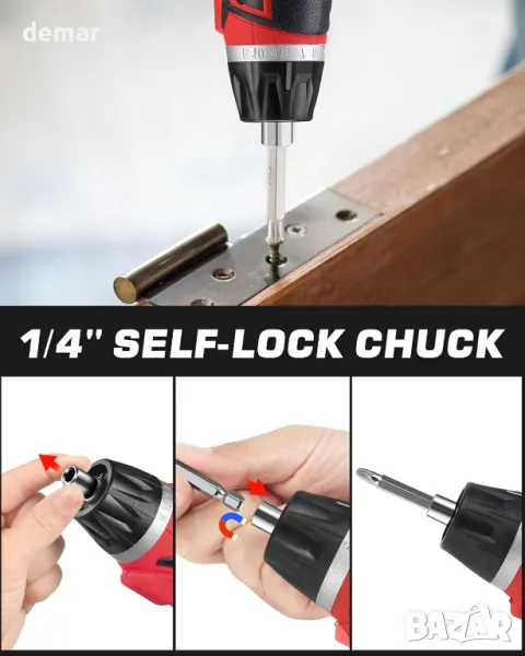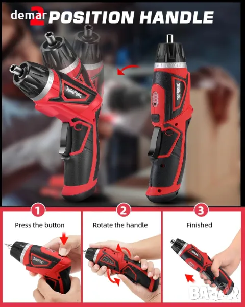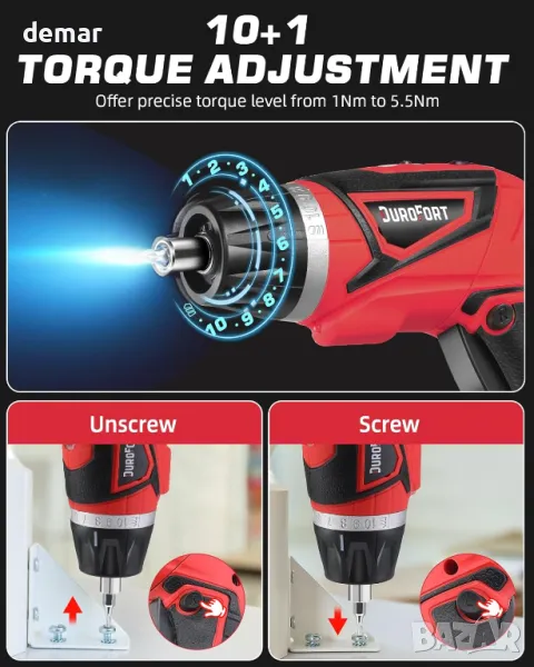 Акумулаторният винтоверт DuroFort разполага с мощен 8V мотор с 5,5Nm въртящ момент и скорост на празен ход от 320 RPM, предлагащ гъвкава работа с двупозиционна ръкохватка и 1/4" шестостенен патронник за лесна смяна на битове. Включва вграден в LED работна светлина за видимост при слаба светлина и гъвкав удължителен вал за достъп до тесни пространства. Захранван от литиево-йонна батерия от 2000 mAh, той се зарежда напълно само за един час и има индикатор за състоянието на батерията и управление напред/назад за прецизно завинтване и се доставя с изчерпателен комплект от 34 аксесоара за различни домакински и домашни задачи.
