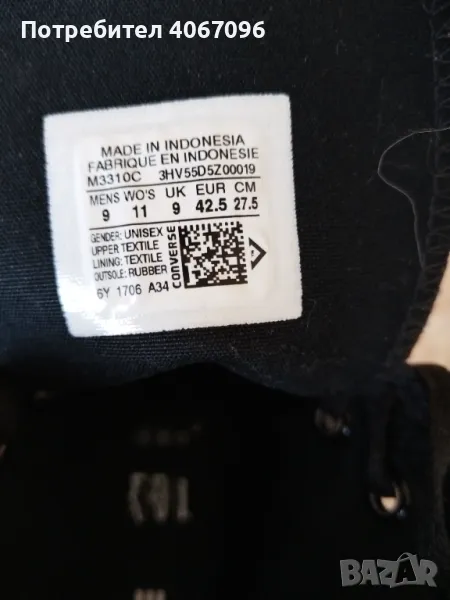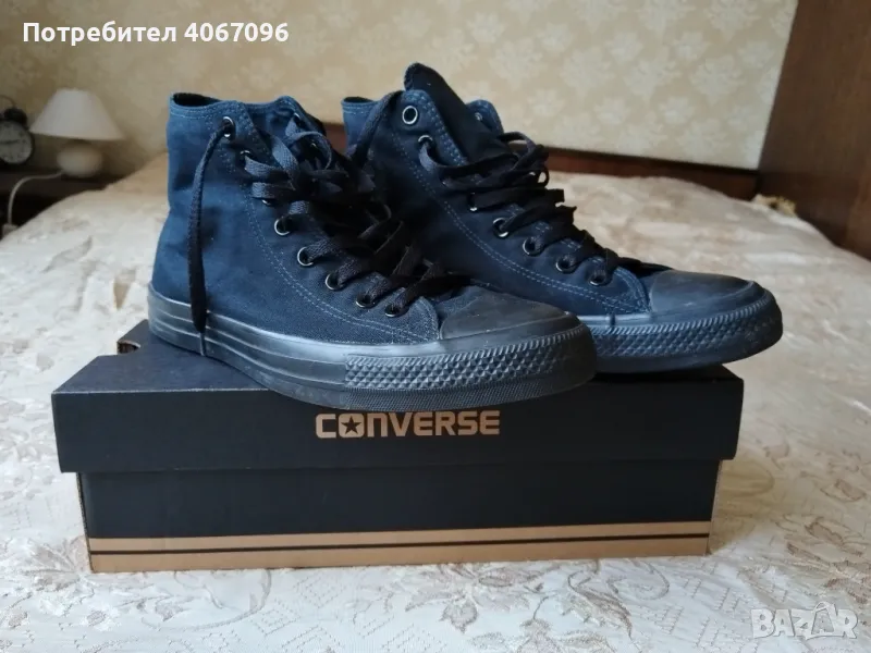 1. Кецове/сникърси CONVERSE. Чисто черни, текстил. Практически нови (обувани са един-два пъти). Размер по етикет: 42,5 - 27,5 см. дължина на стелката. Реално измерена стелката е 28 см. и отговаря на размер 43. Цена - 45 евро.