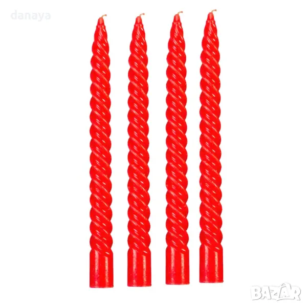 Комплект от 4 броя спираловидни червени свещи. Свещите са чудесни за декорация на маса. Гори с ярък, равномерен пламък. Чудесна украса за празници на всякакъв повод.