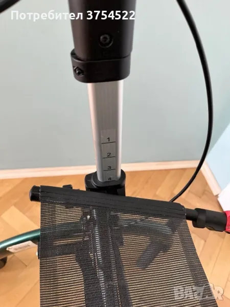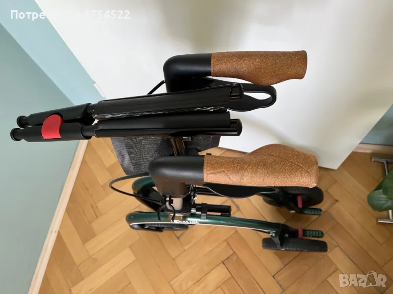 Освен това разполага с държач за бастун, така че да можете да държите бастуна си със себе си и да превключвате между двата, ако е необходимо, а ролаторът се сгъва, когато не се използва.