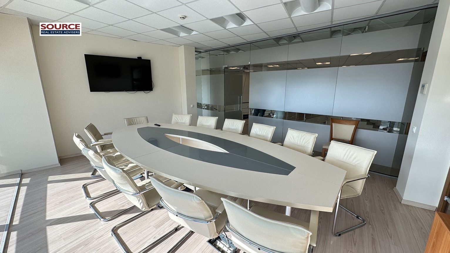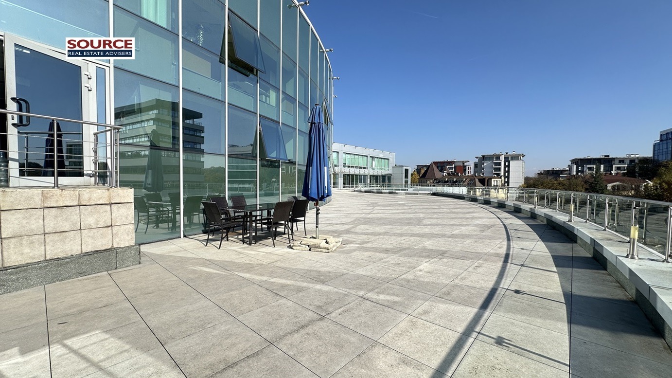 2. Разпределение: 1 много голямо и светло Open space помещение, 9 отделни работни помещения преградени със стъклени и гипсокартонени стени, голяма заседателна зала, оборудвана кухня, зала за почивка, сървърно помещение с индувидуална климатизация, 4 wc, голяма панорамна тераса /която не е включена в указаната площ и чието ползване е безплатно/. Офисът може да бъде изцяло с Open space разпределение или допълнително преграден.