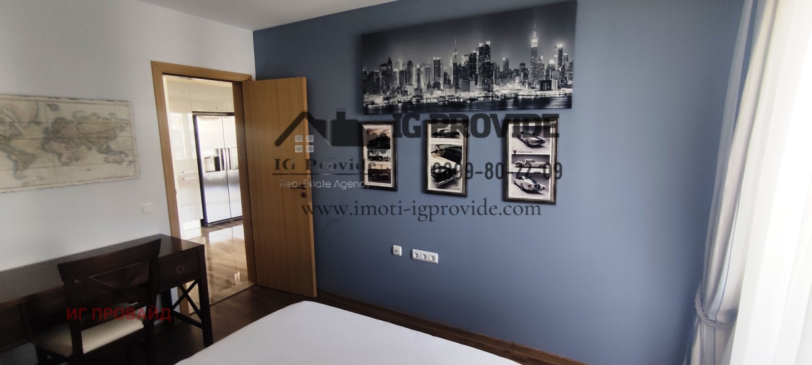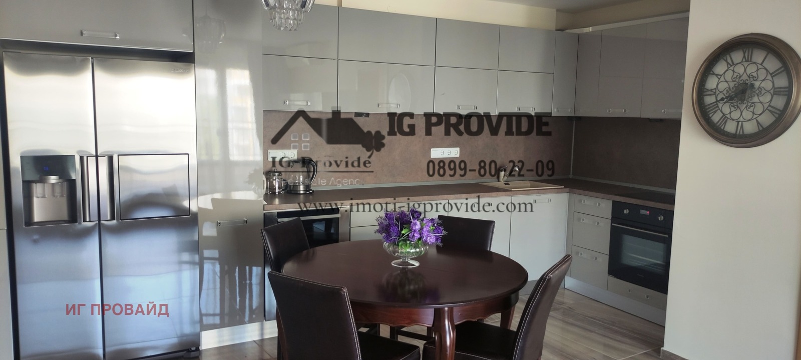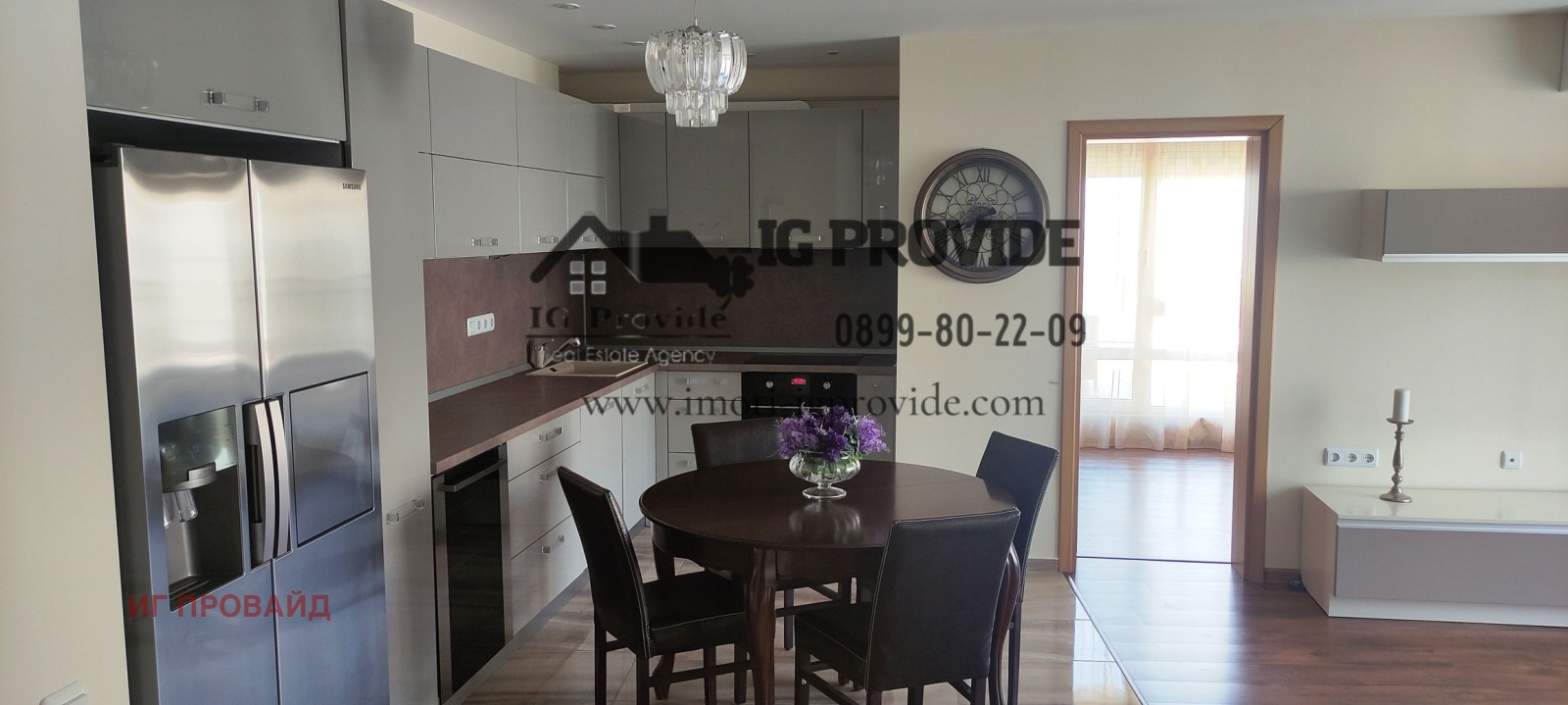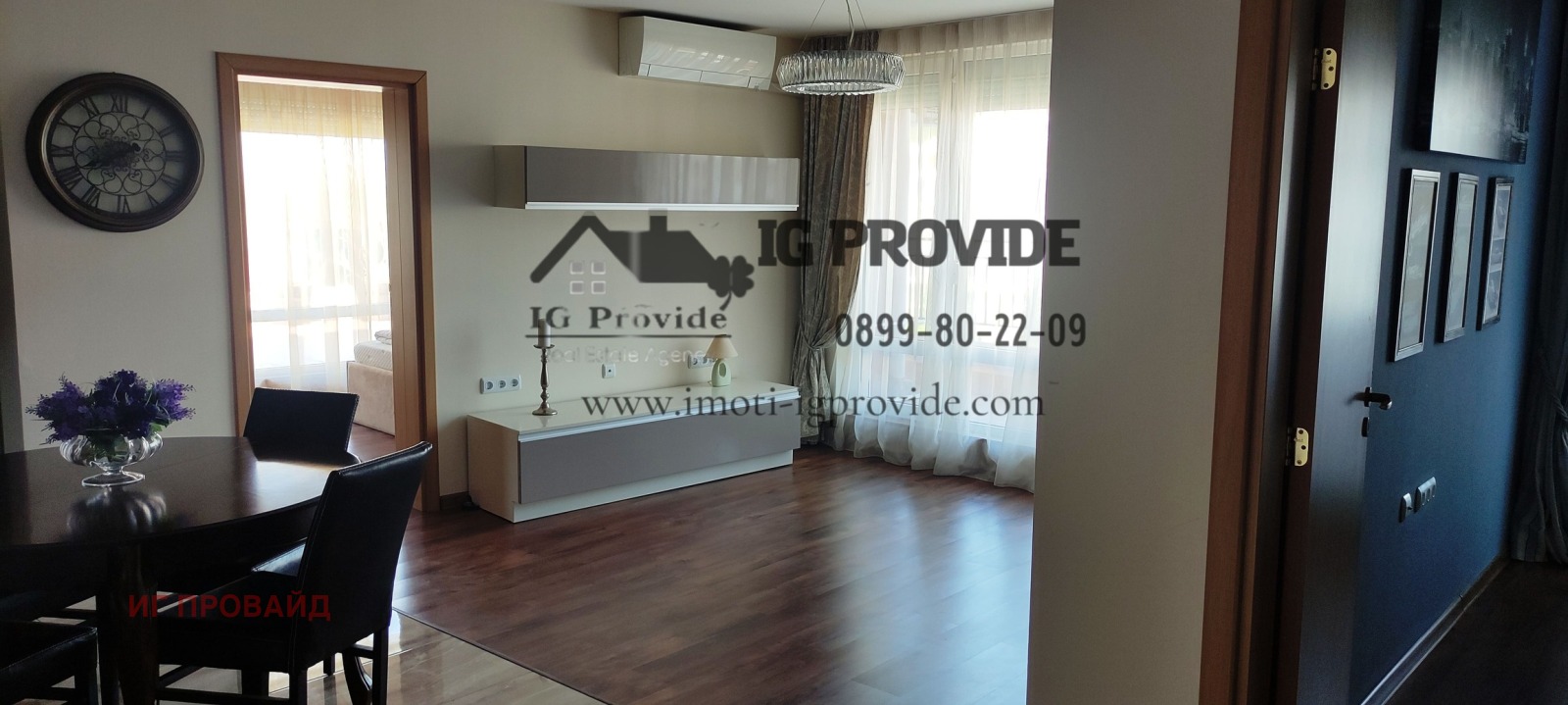Апартамента се състои от всекидневна с кухненски бокс , 2 спални, 2 бани с тоалетни и просторен панорамен балкон на 6-ти последен етаж в сграда с асансьор и е с площ от 121м2 + 30м2 балкон
