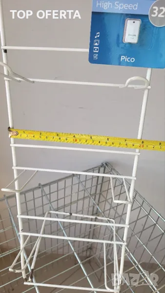 Метален стелаж, идеален за магазини, щандове и изложения. Стелажът е прахово боядисан в бяло, което осигурява привлекателен вид и допълнителна устойчивост. Оборудван с 8 куки за закачане, той е подходящ за излагане на разнообразни продукти – от аксесоари и играчки до бързооборотни стоки.