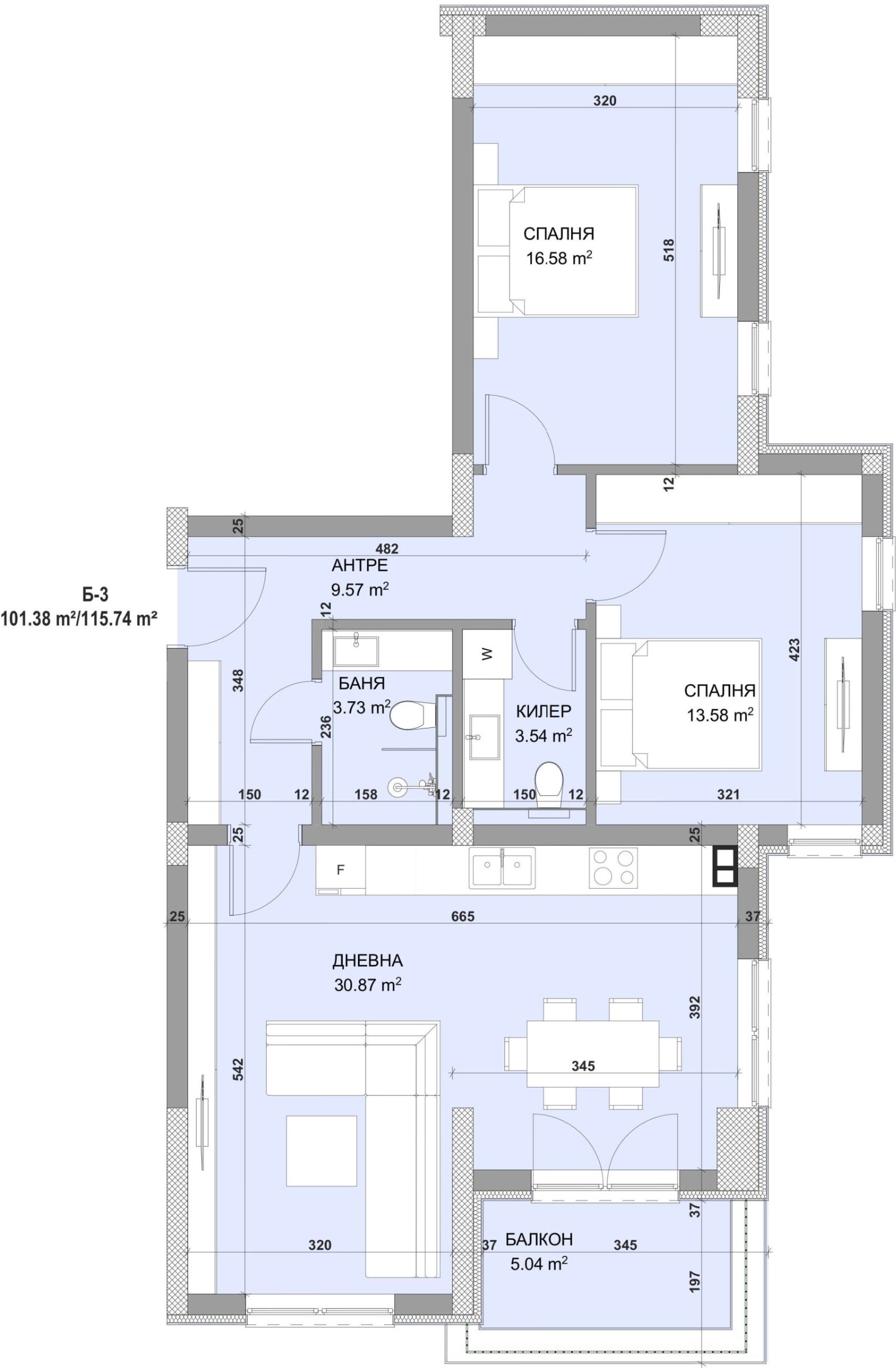 Имотът е с обща жилищна площ от 115,74 кв.м. и се състои от: коридор, дневна с кухня и трапезария, две спални, балкон пред дневната, баня с тоалетна, килер/перално, втора тоалетна . Към всеки имот ще бъдат включени съответните идеални части от общите части на сградата, както и от земята върху която ще бъде изграден обекта.