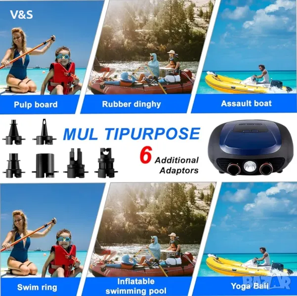Широко използвани: Нашите надуваеми въздушни помпи се предлагат с 6 различни дюзи и могат да се използват за различни надуваеми продукти под високо налягане, като надуваеми дъски за гребане, топки за йога, надуваеми палатки, надуваеми матраци, надуваеми водни продукти и др. Препоръчва се налягане: 10 psi (макс. 15 psi).