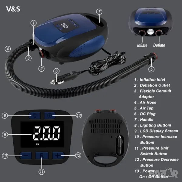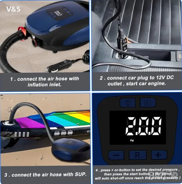 Метод на свързване: помпата се захранва чрез 12 V DC връзка на автомобила. Единият край на надуваемия маркуч е свързан към отвора за надуване/източване на помпата, другият край се свързва към целевото устройство, като изберете подходящата дюза и натиснете настройката, за да стартирате автоматично програмата за надуване/изпразване. С фенерчето, интегрирано в помпата, може да се осигури правилното осветление при надуване през нощта.
