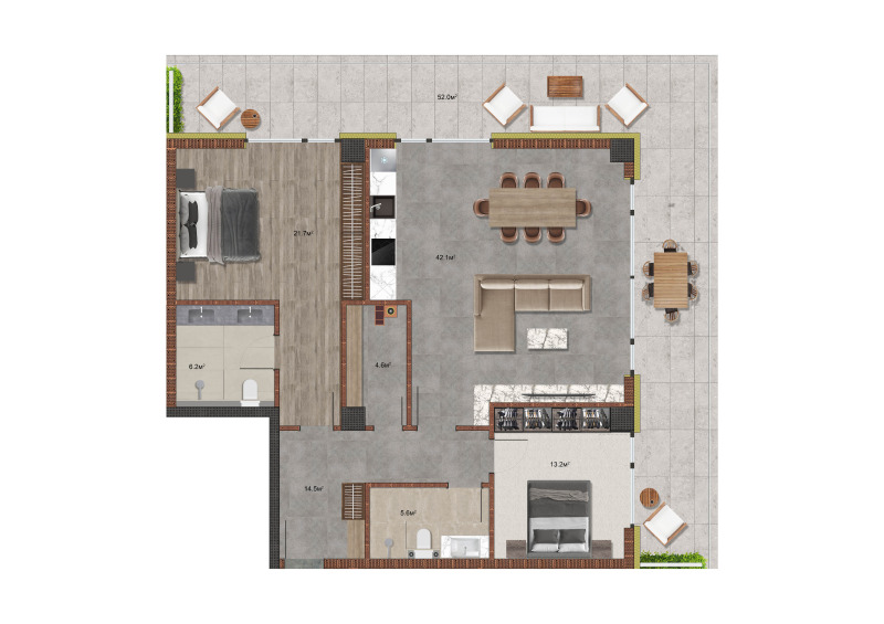 Апартаментът се състои от: антре и коридор, дневна с трапезария и кухненски бокс, две спални, две бани с тоалетни, склад/мокро помещение и тераса.