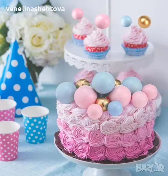 108 броя Светло сини/розови/златисти топчета топки на тел за декорация на торта стиропор → Обява 47806593