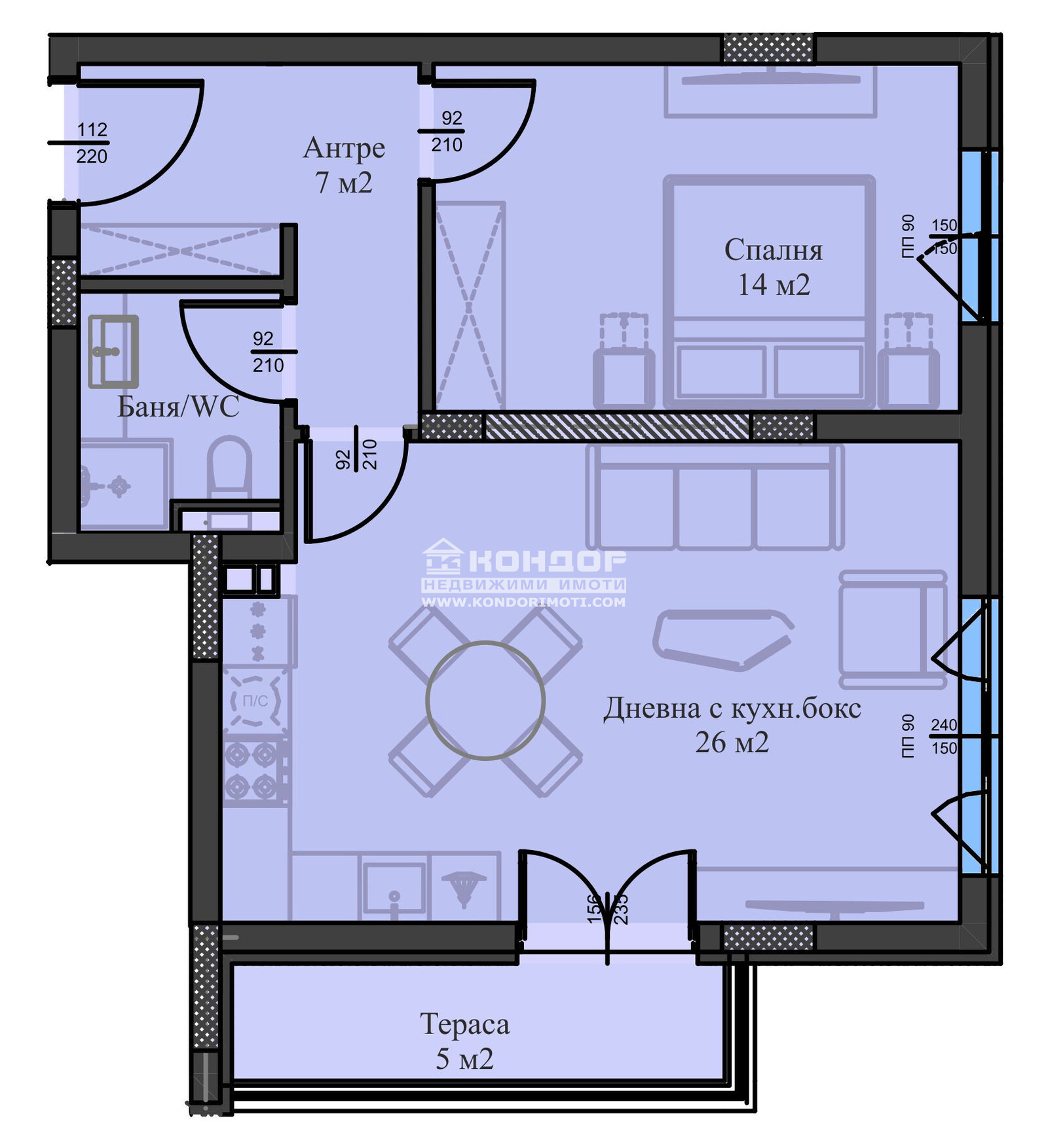 Разпределения - Предлагаме на Вашето внимание просторен двустаен апартамент, състоящ се от ъглова дневна с трапезария и кухненски бокс - 26 м2, една спалня 14м2, баня с тоалетна, входно антре и тераса.