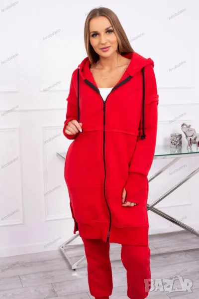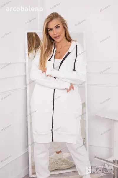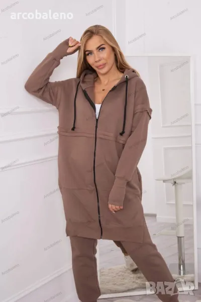 Представяме ви комплект суичър и панталон. Суичърът е с качулка и джобове. Суичър се закопчава с цип, в долната част отстрани има цепки. Панталонът е с широк ластик на талията и ленти в долната част на крачолите. Комплектът е изработен от изолационен материал. Размерът е универсален и ще бъде подходящ за дами с размери S, M или L.