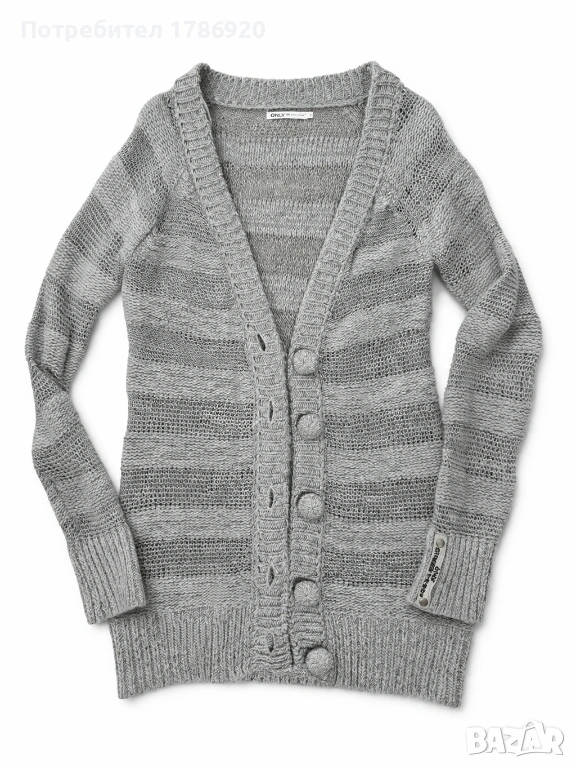 Предлагам стилна дамска жилетка от марката Only в нежен сив цвят с интересен плетен дизайн. Жилетката е с красив модел на редуващи се ивици и декоративни кръгли копчета отпред. Разполага с дълги ръкави, ребрести маншети и ребрест кант по цялата дължина на отвора. Материята е мека и приятна на допир, идеална за пролетно-есенния сезон. Жилетката е без следи от носене. Перфектно допълнение към всеки гардероб - съчетава се лесно както с дънки за ежедневна визия, така и с елегантни панталони или пола за по-официални случаи.