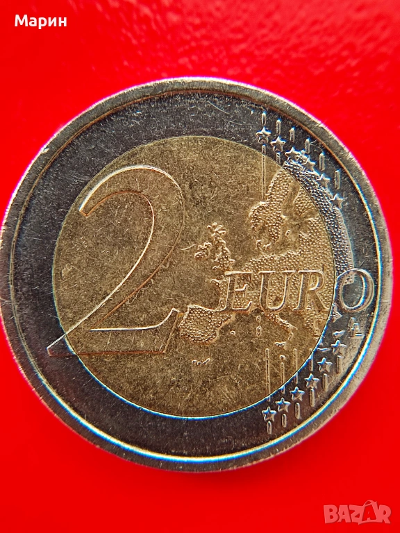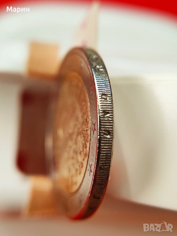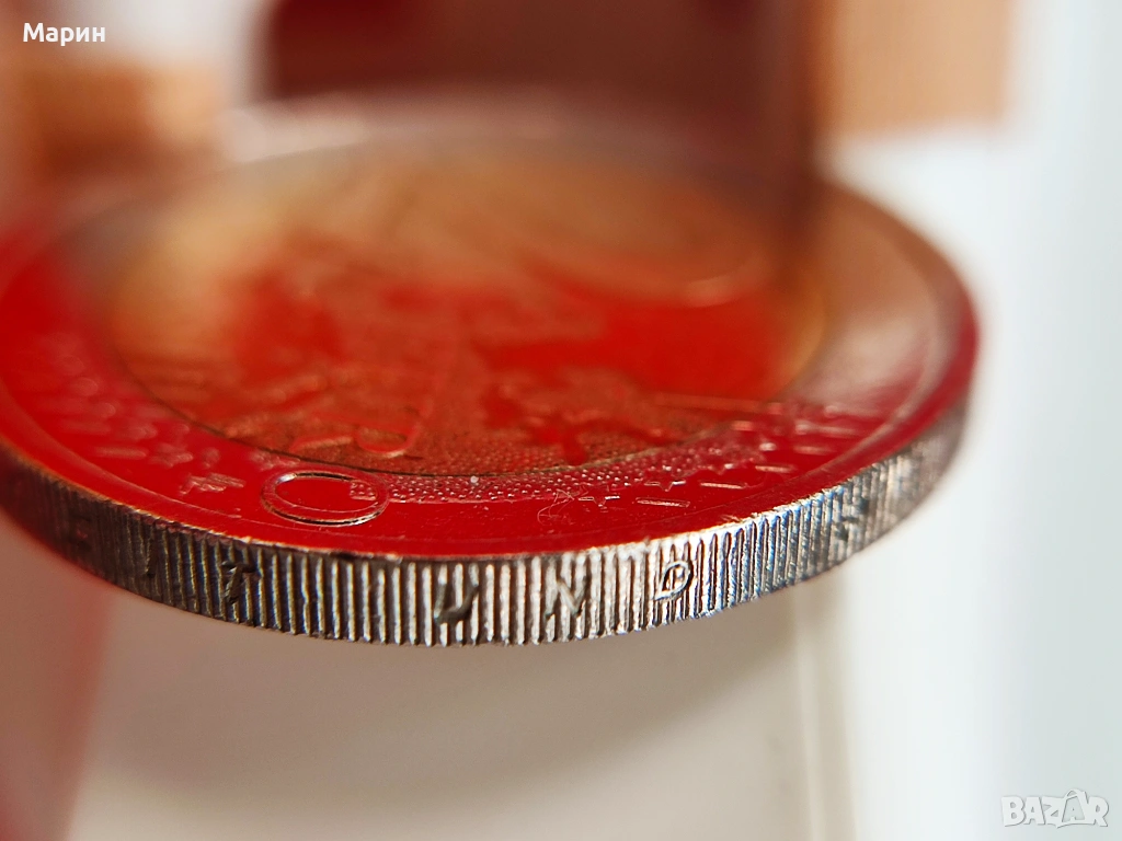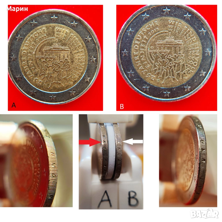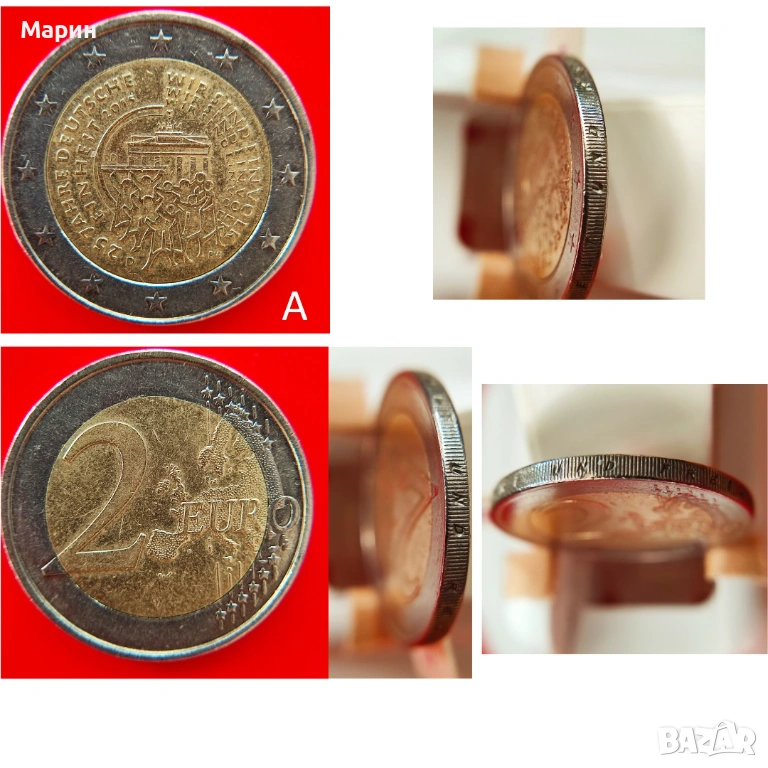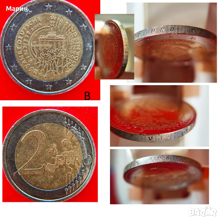 Монета 2 Евро 2015 D на снимка „А“ , е със сгрешен гравиран текст на ръба на монетата, който е възможно да се чете правилно единствено от страната на реверса. Този дефект на монета „А“ е показан на няколко снимки, като за сравнение е показана и