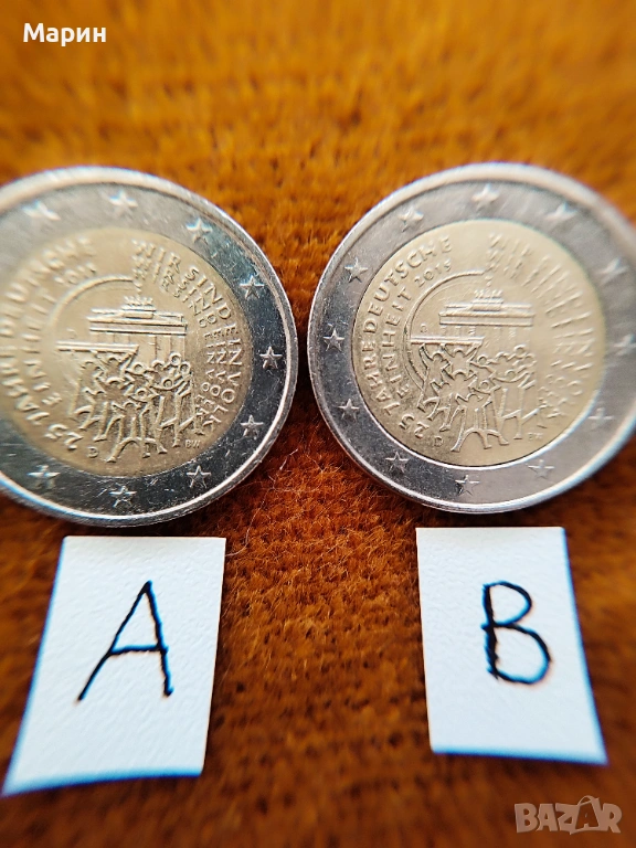 Двете монети 2 Евро 2015 D показани на снимки „А“ и „В“ са емитирани в един и същи монетен двор на Германия в Мюнхен и имат еднакъв mint mark D.