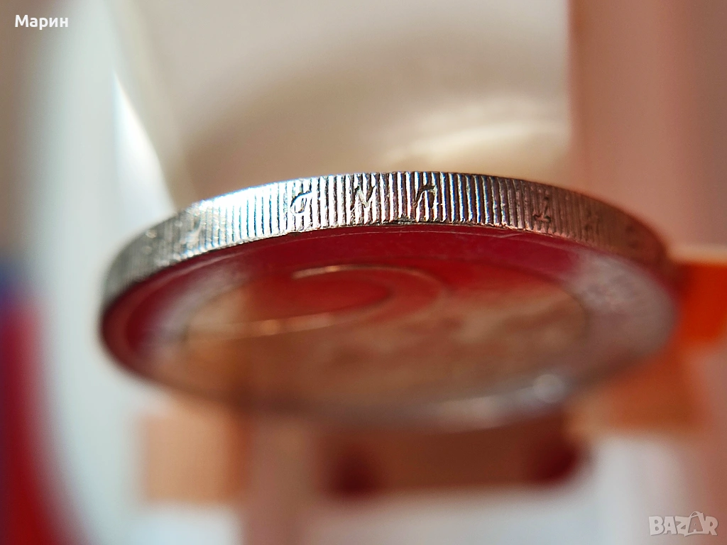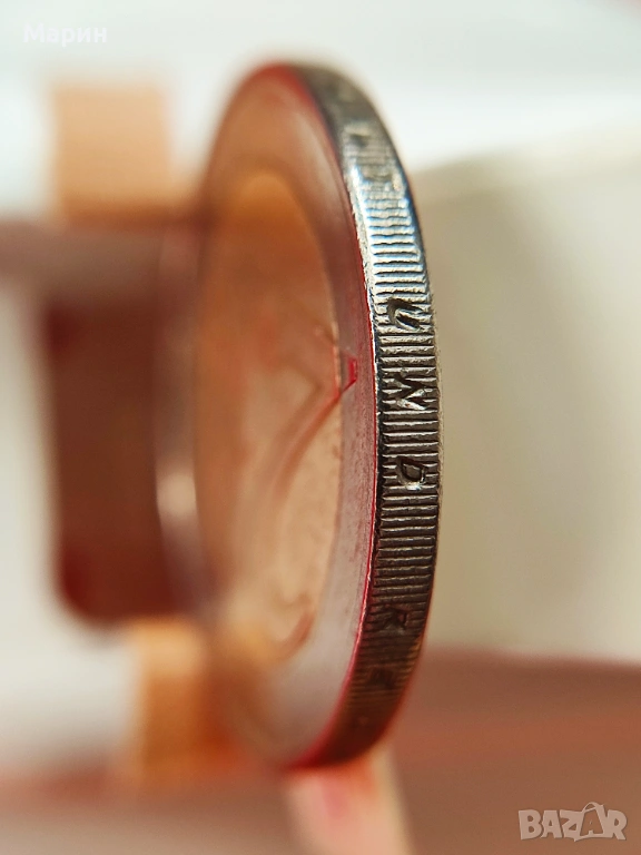 Вторият дефект е в дизайна на монетата и е много слабото на места гравиране на текста върху страничният ръб на монета
