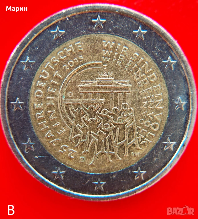 2 Евро 2015 D е възпоменателна немска монета с послание - 25 години германско единство. На монетата са изобразени кода на държавата D (ГЕРМАНИЯ) и релефната буква D (Мюнхен). Страничният ръб на монетата е назъбен с гравиран надпис от ляво на