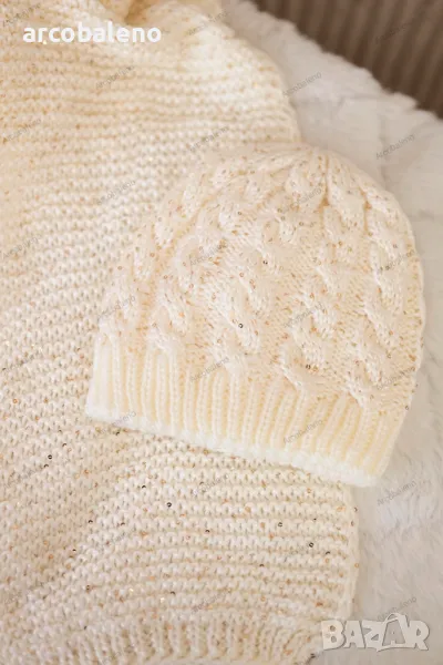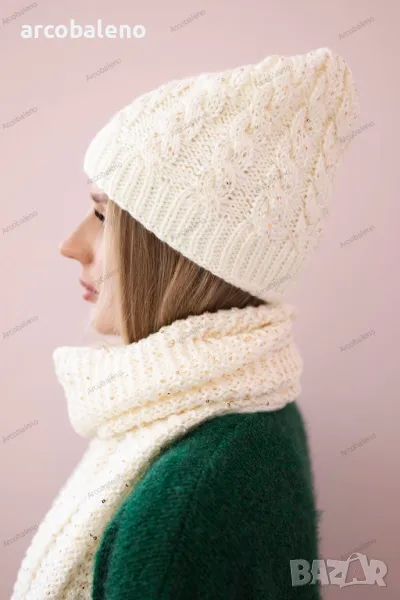 Предлагаме ви топъл комплект, състоящ се от шапка и шал. Комплектът се отличава с атрактивен външен вид и солидна изработка. Много красив десен ще направи комплекта модерен и практичен аксесоар за много сезони. Размерът на шапката и шала е универсален.