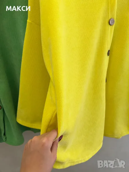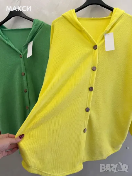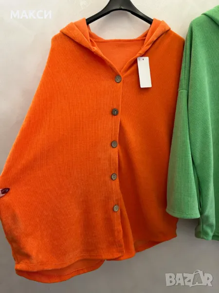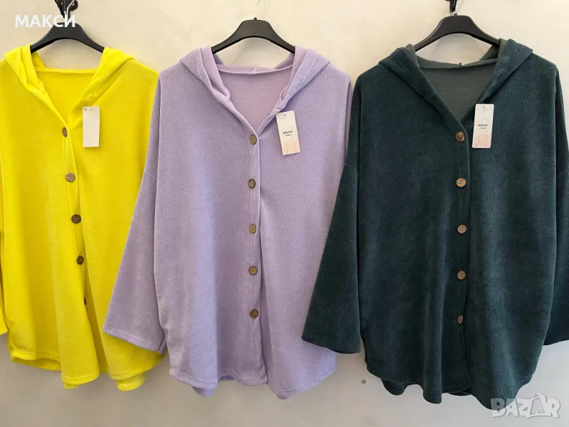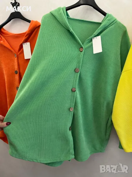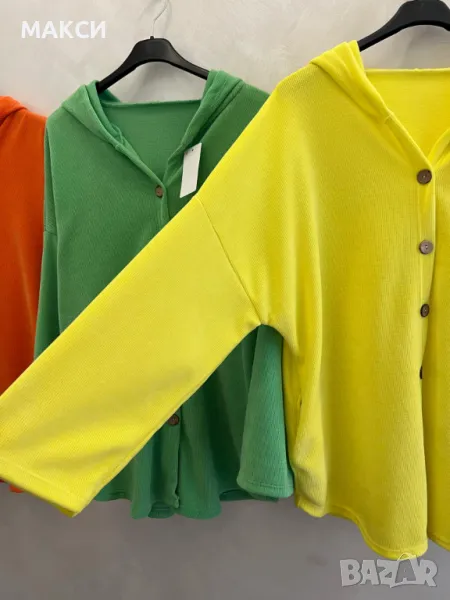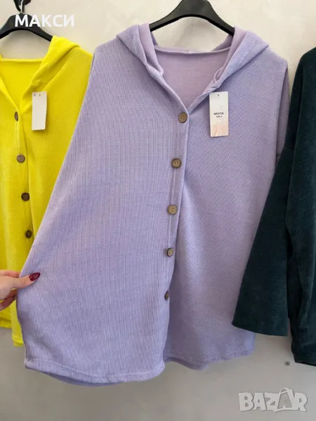 Макси модерно прекрасно еластично джинсово горнище с качулка, скрити странични джобове, стилни извивки и копчета в различни цветове - люляково, оранжево и патешко жълто