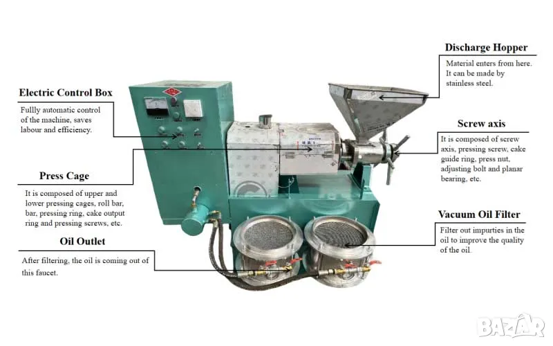 Тази машина е винтова машина и е усъвършенствана машина за добив на масла, която се характеризира с високи нива на изходна мощност, добро качество, прост дизайн и непрекъсната работа. Тази серия маслени преси може да се използват за различни суровини като ябълково семе, семена от рапица, фъстъци, рапица , памучни семена, сусамени семена, семена от маслини, слънчогледово семе, кокосови семена и семена от трева.