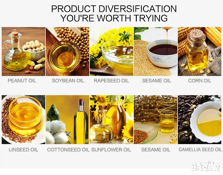 масло може да извлича от фъстъци, сусам, орехово месо, зеленчукови семена, слънчогледово семе, бадеми, кедрови ядки, ленено семе, ядки тиква, соя и т.н.