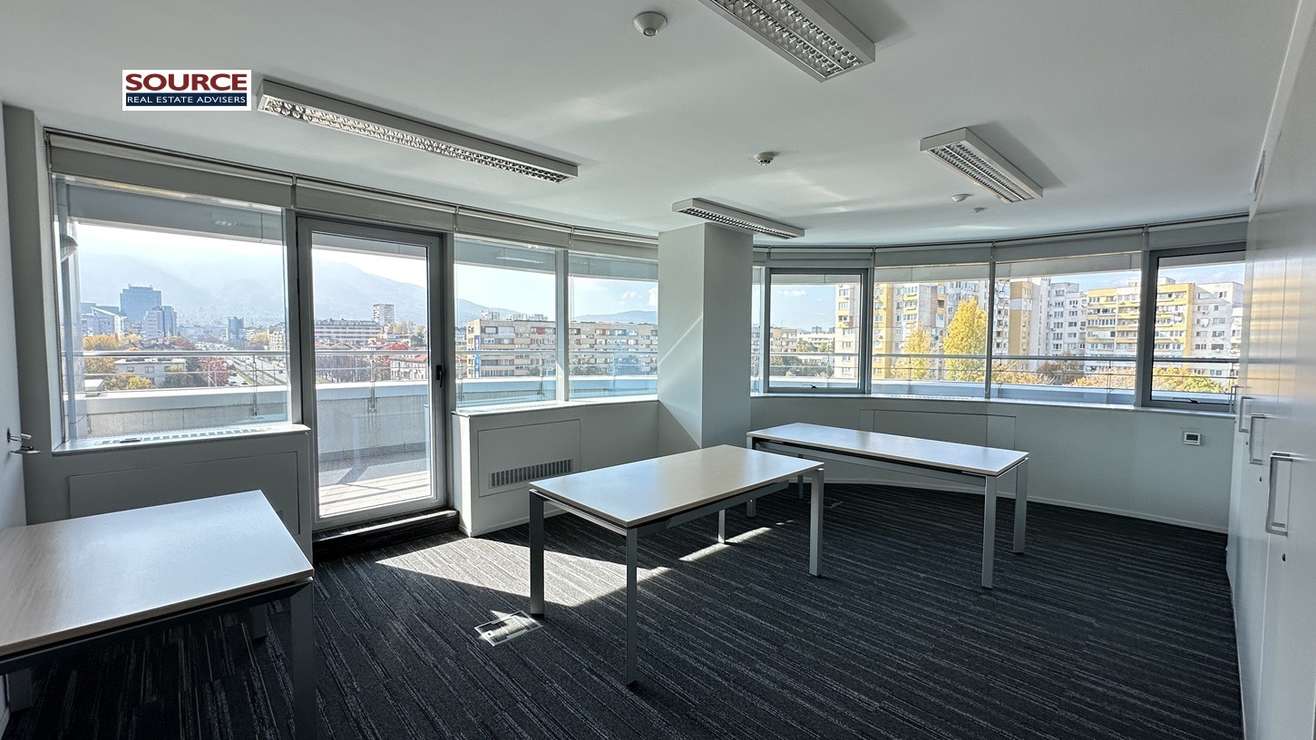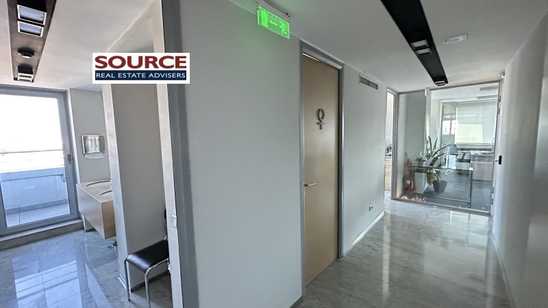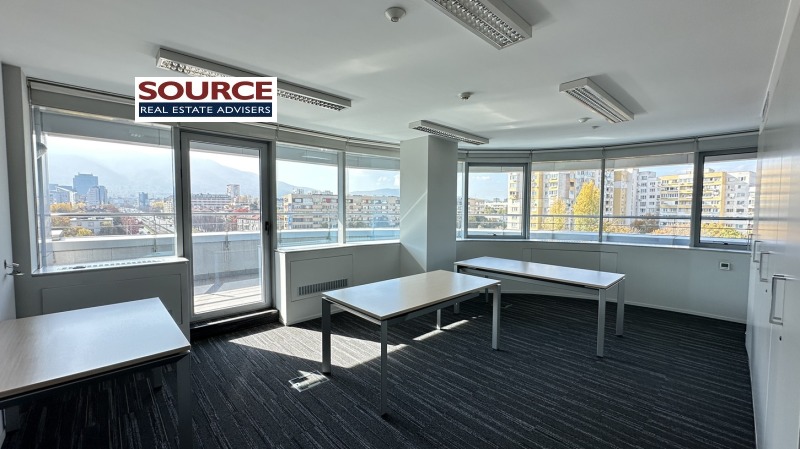 2. Разпределение: 2 големи Open space помещения, 3 отделни работни помещения преградени със двойни стъклени и гипсокартонени преградни стени, оборудван кухненски бокс, 2 wc, панорамна тераса /която не е включена в указаната по-горе площ, бонус е и не се заплаща/. Офисът може да бъде изцяло с Open space разпределение или допълнително преграден според изискванията на Наемателя.