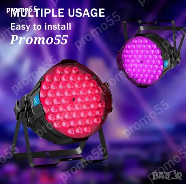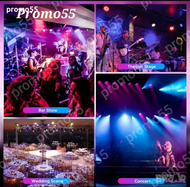 Сценичният проектор е съставен от 54 LED RGB 3 в 1 високомощни лед перли, които са супер ярки, обхватът на осветяване може да бъде 6-10 метра, оптичният ъгъл е 26 градуса, равномерна светлинна мощност при смесване на цветовете.