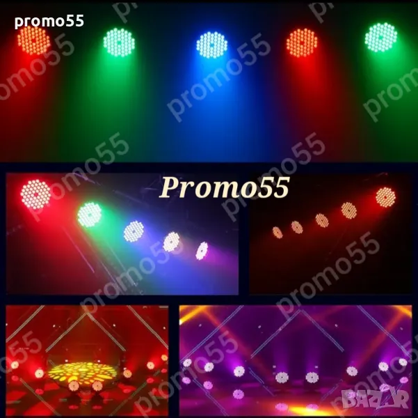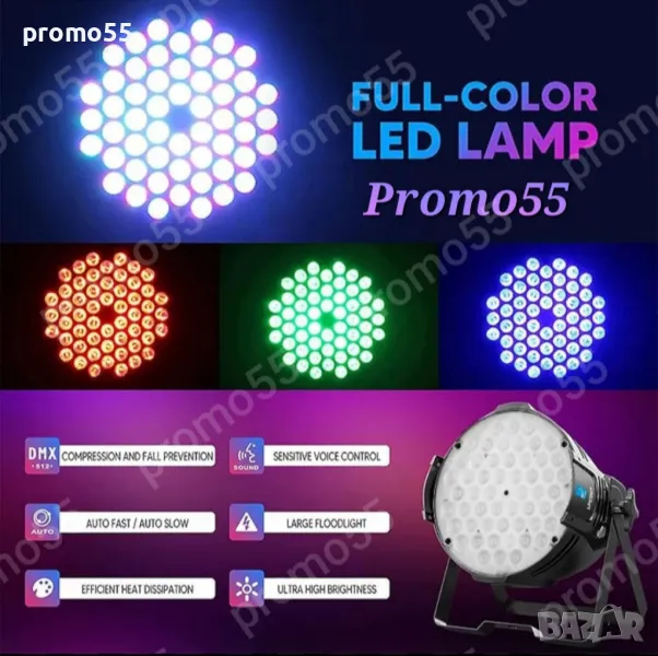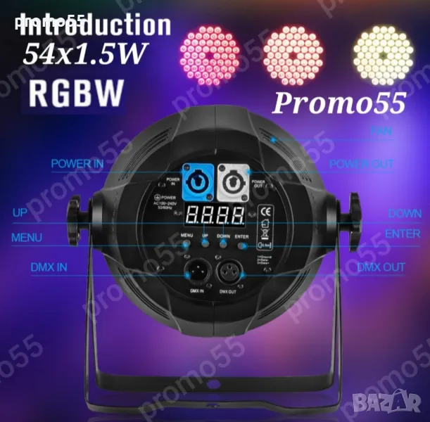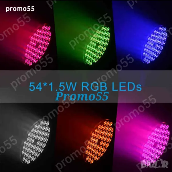 Супер ярък Лед проектор с нов светлинен ефект 54 x 1,5W LED номинални светлини RGB - безброй цветове, супер ярък и регулируема яркост. Нов светлинен ефект на кръгъл цвят придава повече ефекти на сценичното осветление. Ефект на многоетапно осветление, прожекторът осветява с различен светлинен ефект като статичен цвят, промяна на цвета, избледняване, кръгов цвят, скачане на цвят. Светлинният ефект се регулира на скоростта. Без трептене.
