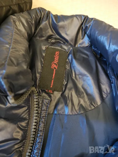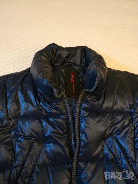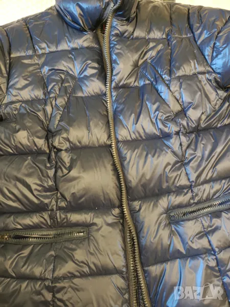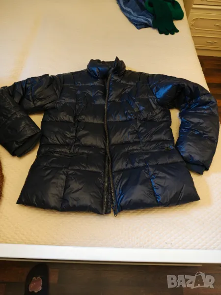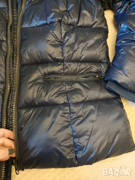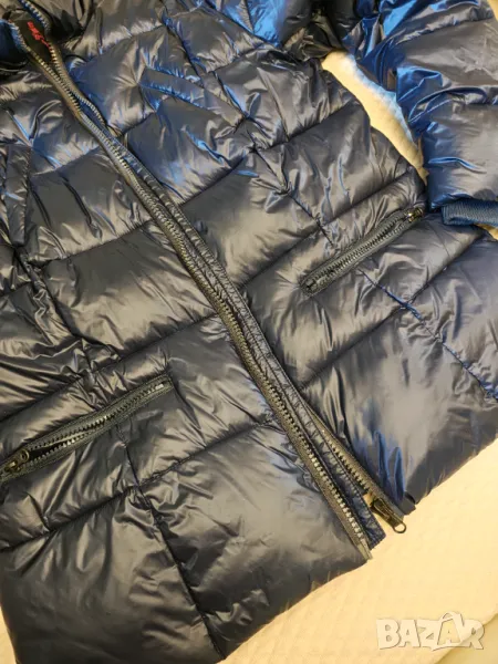 Оригинално естествен пух и пера цвета е тъмно син с гланцов ефект.Дължина 68 см мишници 52 см рамена 44 см.Липсва качулката не в намират след преместването Носено е един сезон Без забележки Цената е съобразена с липсата на качулката. Не приемат бартер и пазарлъци.