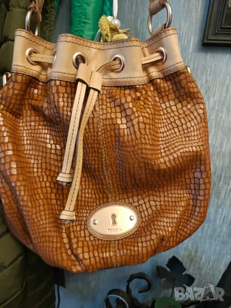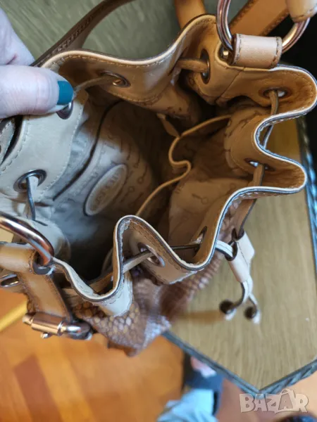 Оригинална страхотна чанта от естествена кожа цвета се мени а металните елементи са с розова позлата.С една дръжка 75 см може да се носи и през ръка и през рамо .Размер 30 на 35 см Дъното е твърдо с размер 16 на 13 см гледайте снимките.Като нова е носила съм в най много 5 пъти.Крсйна цена Пазарлъци и бартери не ме интересуват