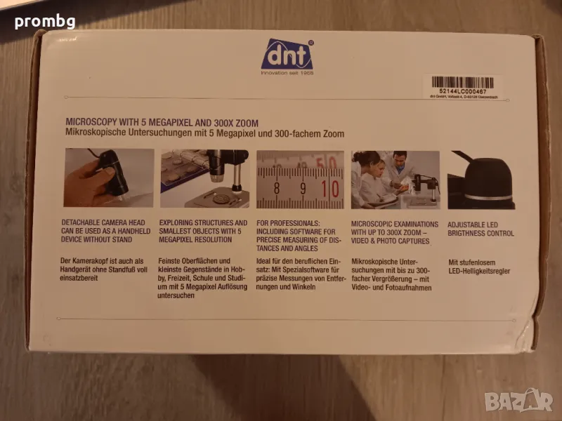 5 MP дигитален микроскоп 300x. ZOOM, Германия. DigiMicro Profi е оборудван с двуосен обектив, регулиране на височината на стойката. Оборудван с 8 бели светодиода за осветяване на обекта и специализиран софтуер за прецизни измервания. DigiMicro Profi работи като цифрова камера: обектите се увеличават, фотографират или заснемат и изображенията се прехвърлят на компютъра или лаптопа чрез USB порт.