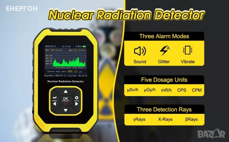 Детекторът за ядрена радиация използва брояч на Гайгер-Милър за по-висока точност на измерването. Той отчита интензитета на йонизиращи лъчения бета частици, гама лъчи и рентгенови лъчи.