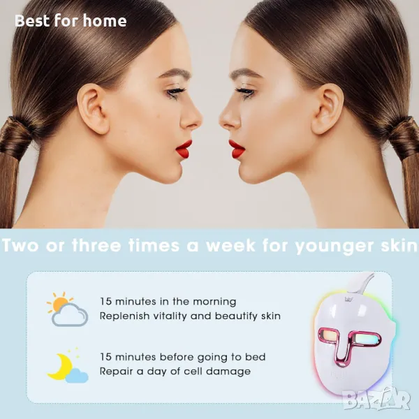 Червената светлина с дължина на вълната, центрирана на 635-644 nm, и инфрачервената светлина с дължина на вълната, центрирана на 845-855 nm, за лечение на бръчки по лицето. Синята светлина с дължини на вълните, центрирани на 430-445 nm, и червената светлина с дължини на вълните, центрирани на 635-644 nm за лечение на леко до умерено акне по лицето.