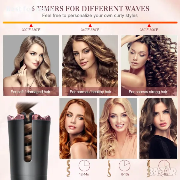 【6 настройки за температура и 6 времена за всеки тип коса】: Безжичната машина за коса осигурява 6 температури от 320°F до 420°F за момичета с различно състояние на косата. 8 сек./10 сек./12 сек./14 сек. Безжичната маша ще се изключи автоматично след 10 минути работа на празен ход, спестява и предпазва батерията значително.
