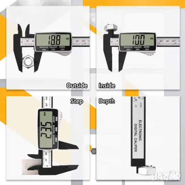 [Многофункционален цифров дебеломер]-Дигиталните дебеломери могат лесно и точно да измерват външен диаметър, вътрешен диаметър, стъпка, дълбочина и т.н. Нулевата функция може да калибрира повторно шублера във всяка точка за по-висока точност. Функцията за преобразуване на милиметър / инч може да се адаптира към навиците на различните потребители. Функцията на бутона за включване / изключване и функцията за автоматично изключване за 5-8 минути могат да ви помогнат да спестите батерията.