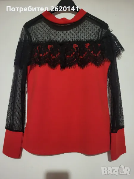 Елегантна червена блузка с дантелен черен ръкав. Изпращам с опция преглед и тест, с куриерска фирма Спиди.