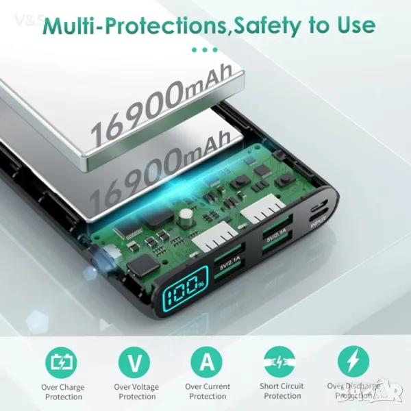 【Универсална съвместимост и превъзходна безопасност】 Тази захранваща банка е универсално съвместима с всички продукти чрез USB кабел за зареждане, включително всички iPhone, мобилни телефони с Android, таблети и други USB устройства. Вграденият интелигентен чип, захранващата банка предпазва вашите устройства от прекомерен ток, прегряване и презареждане, за да гарантира безопасността на вашето устройство.