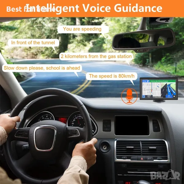 【Напомняне за интелигентно гласово излъчване】GPS система с гласова навигация завой по завой (многоезична версия), изчерпателни гласови указания, бърза навигация за безопасност в реално време Посока на напредъка; Интелигентна корекция на грешки, когато направим грешка, тя бързо променя/изчислява нов маршрут. Ако шофирате по магистралата, ще покаже много ясна посока/лента, как да напуснете магистралата или да смените лентата на друга магистрала, без да се притеснявате, че ще се изгубите отново.