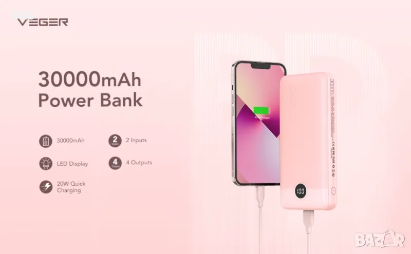 VEGER Power Bank 30000mAh, 20W бързо зареждане PD 18W QC 3.0 USB C батериен пакет Преносимо зарядно