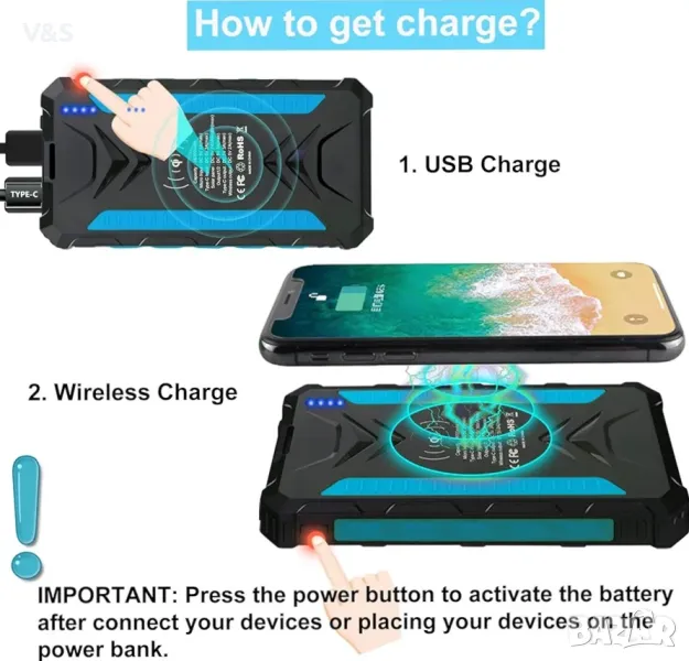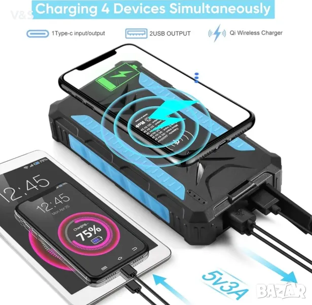 Безжично преносимо зарядно устройство: соларна захранваща банка с безжичен изход поддържа всички активирани мобилни телефони за индуктивно зареждане. Съвместим с iPhone 12/11 Pro Max / XS Max/XR / 8 plus/6S/7, Samsung Galaxy S20 / S10/S9/S8/ Note 10 Plus и др. Почти всички смартфони. И това слънчево захранване има 2 USB порта, 1 входно/изходен порт Type-C и 1 микро входен порт, които могат да зареждат 4 устройства едновременно.