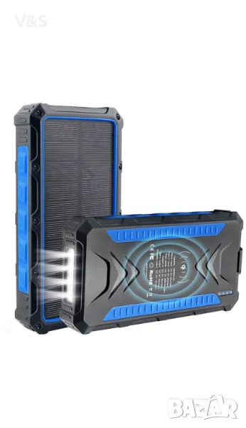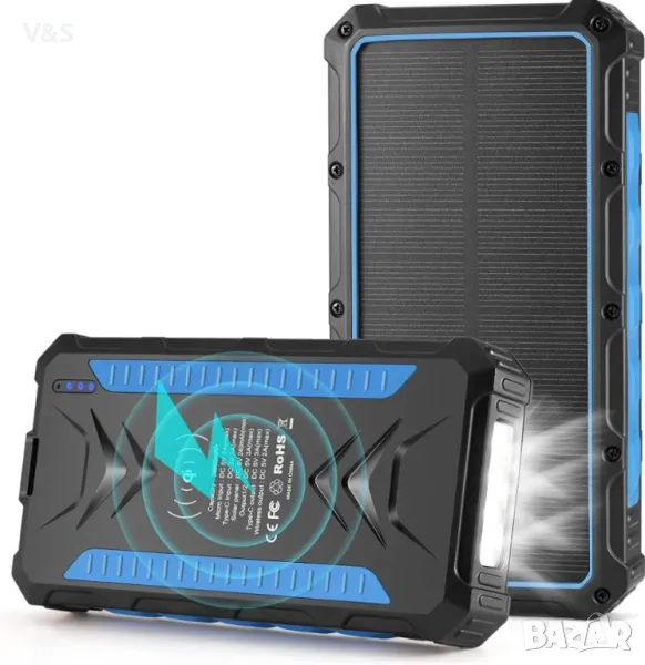 Външна батерия 36000 mAh, соларен Powerbank с Qi безжично зареждане, USB и USB C изход, със соларен панел, LED фенерче
