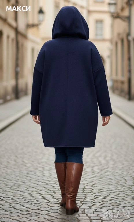Макси модерно елегантно дълго горнище/палто с качулка, джобове с ефектно закопчаване и метален цип в → Обява 47818773