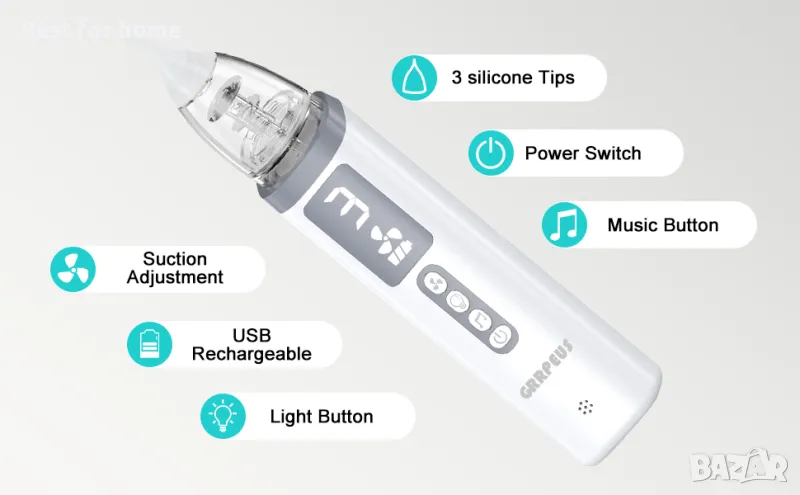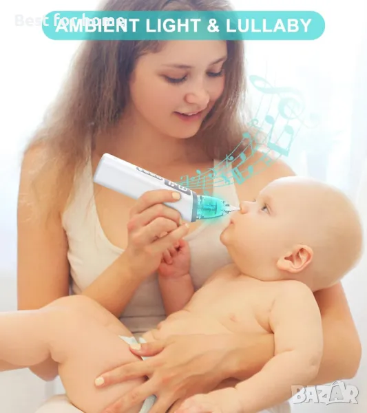 Относно този артикул Безопасен и удобен: нашият бебешки аспиратор за нос е изработен от мек, безопасен за храна силикон и нежен към чувствителния нос на вашето мъниче. С три накрайника осигурява максимален комфорт по време на засмукване и ви помага да премахнете слузта и течностите от носните проходи. Ефективен ефект: нашият бебешки аспиратор за нос има три регулируеми нива на засмукване и е идеалният избор за грижа за новородени. Премахва назалната конгестия бързо и без усилие и насърчава благосъстоянието и здравето на вашето бебе. Лесен за използване и почистване: благодарение на ергономичната форма и ясния LCD дисплей, нашият бебешки назален аспиратор е лесен за използване дори от първи родители. Подвижните и прозрачни части се почистват лесно с топла сапунена вода. USB акумулатор: електрическият назален аспиратор е USB акумулаторен и има живот на батерията 30 дни след пълно зареждане. В допълнение, благодарение на компактния си дизайн и включената чанта за съхранение, той е идеален за транспортиране, така че вече не е нужно да се притеснявате за закупуване на батерии.
