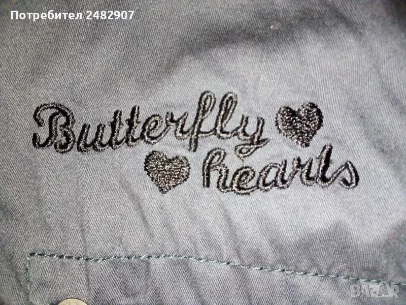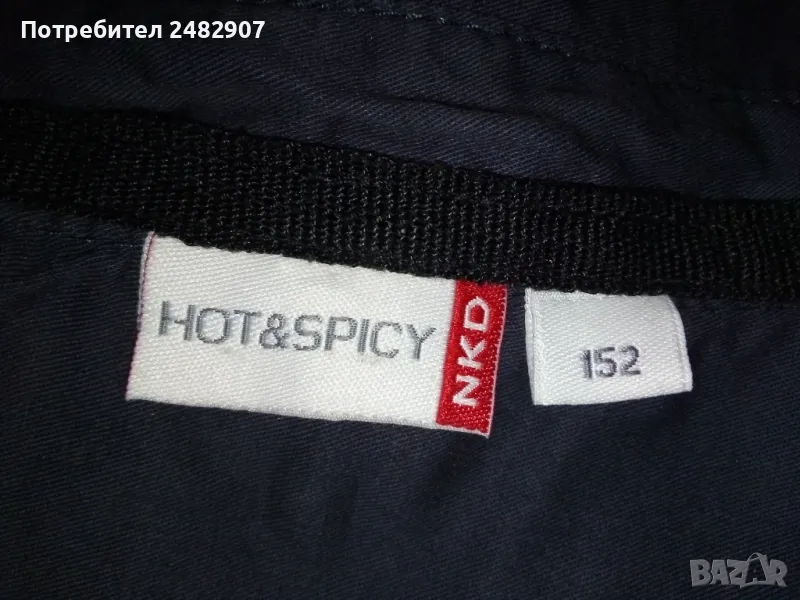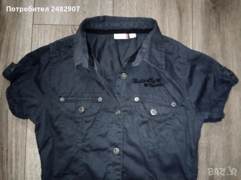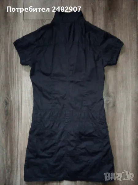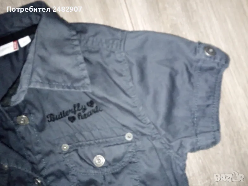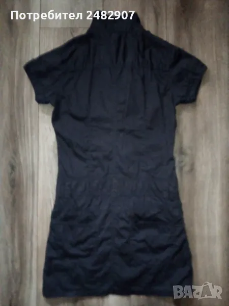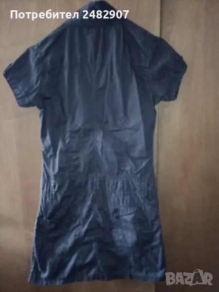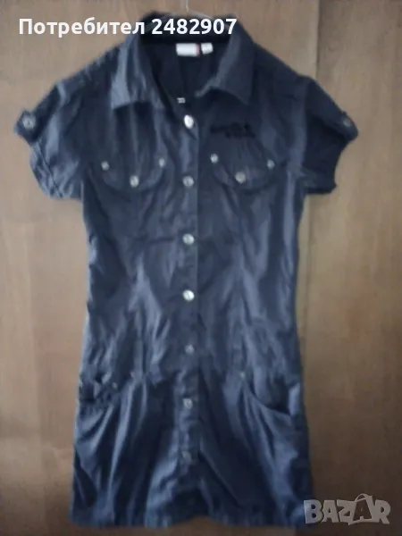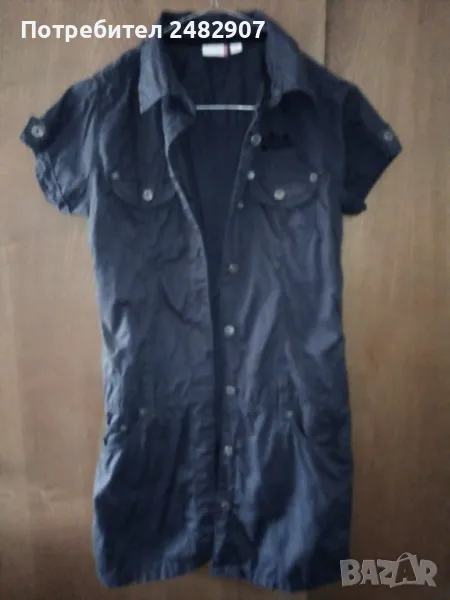 Къса детска рокля, цвят "антрацит" за ръст - 152 см. Съдържа 100 % памук. Ширина в раменете - 34 см, ширина под мишниците - 44 см, ширина в долната част - 46 см, дължина от рамото до долу - 78 см, дължина на ръкава от рамото - 13 см, ширина на ръкава в долната част - 14 см. Много запазена, почти не е използвана, закопчаване със 7 броя метални копчета отпред. Много тънка.