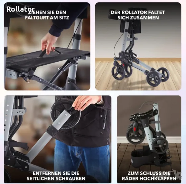 ЛЕСЕН ЗА ТРАНСПОРТИРАНЕ - Ако ролаторът трябва да се съхранява в колата, например, той може да се сгъне, за да спести място в рамките на няколко секунди и да се транспортира лесно.