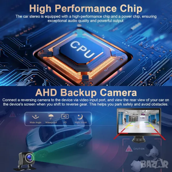 - 【Високопроизводителен чип и задна камера】 Високопроизводителният чип осигурява по-добри възможности за обработка и декодиране на звука, като прави музиката и звука по-ясни и по-качествени. Той може да осигури достатъчно захранване, така че аудиото да може да поддържа ясен и силен изход при висока сила на звука. HD камерата за заден ход може да ви помогне да наблюдавате задната част по-безопасно и удобно, когато се движите на заден ход, с висока разделителна способност и широкоъгълен изглед, така че да виждате ясно заобикалящата ви среда, за да избегнете сблъсък и инцидент.
