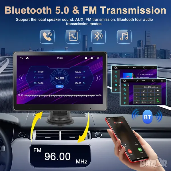 - 【Bluetooth 5.0 и FM предаване】 Радиото за кола е оборудвано с технология Bluetooth 5.0 за по-високи скорости на предаване и по-стабилни връзки. Поддържа функцията за предаване на FM, можете да получавате аудио сигнали от FM радиостанции, като регулирате честотата, а също така поддържа звук от локални високоговорители, можете да възпроизвеждате музика директно през вградените високоговорители на стерео уредбата на вашия автомобил без допълнителни външни високоговорители. Има и функция AUX вход.