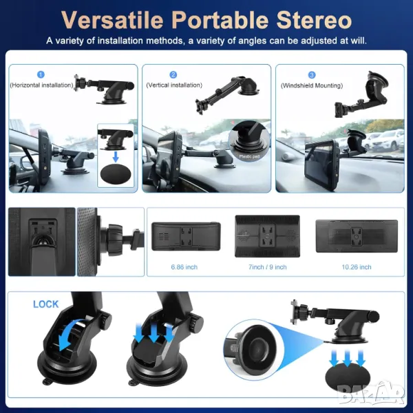 - 【Няколко метода за инсталиране и регулируема】 поддържа хоризонтална и вертикална инсталация и инсталация на предното стъкло. Можете да изберете подходящия метод за монтаж според вашите предпочитания и пространството на вашия автомобил. Стереосистемите за кола също се предлагат с прибираща се стойка и екран, който се върти на 360°. Можете да регулирате позицията и ъгъла на монитора според нуждите за най-добро гледане и работа!