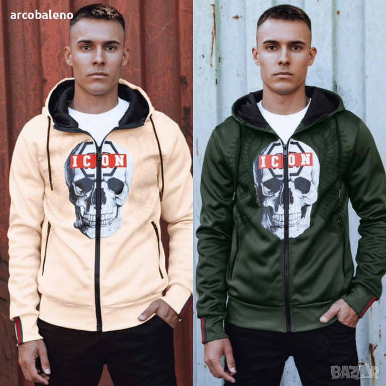 Суичър, който съчетава отличителен дизайн с удобството на ежедневно носене. Принтът с череп и надпис "ICON" му придава уникален характер, идеален за хора, които обичат да се открояват от тълпата. Изработен от висококачествен материал, той осигурява топлина и комфорт, като същевременно подчертава вашия индивидуален стил. Перфектен за всеки повод - от градски разходки до срещи с приятели.